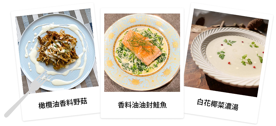 🍽️ 橄欖油香料野菇 🍽️ 香料油油封鮭魚 🍽️ 白花椰菜濃湯