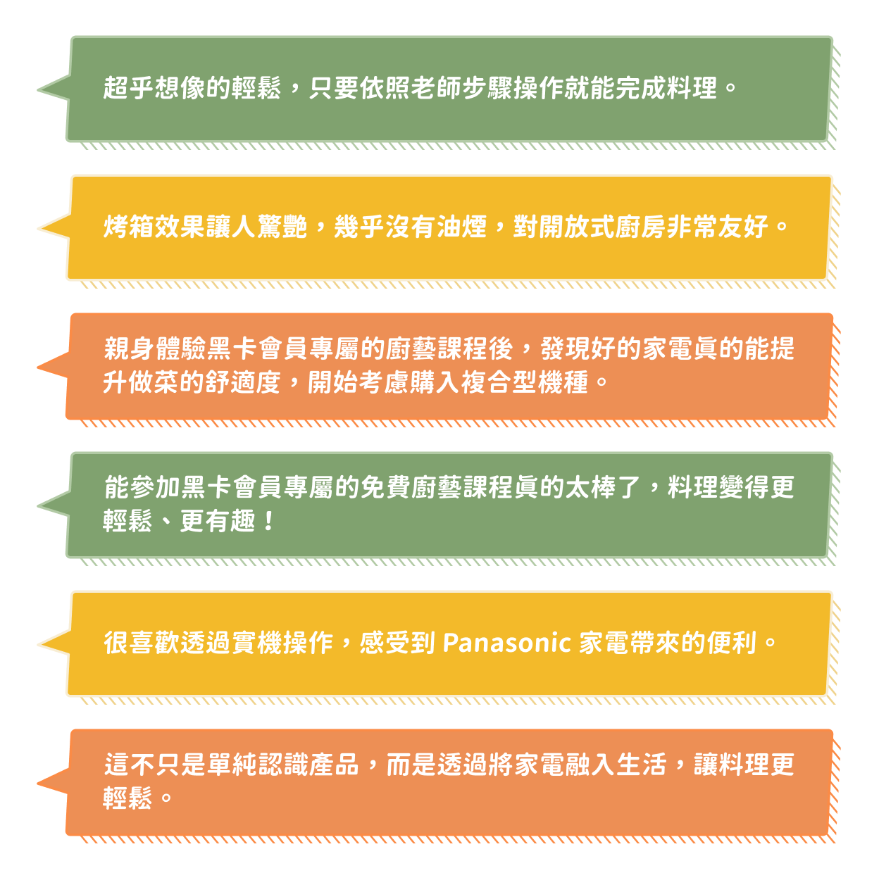 看完大家的分享是不是也很想要一起報名參加了呢? CLUB Panasonic VIP 廚藝課程不僅有專業講師免費教授創意料理,還能讓您輕鬆學會 Panasonic 廚房家電的實用烹飪技巧,提升料理樂趣與品質。 現在只要您近五年會員商品註冊金額達十萬元以上,即可立即升等黑卡菁英會員,每月免費報名 VIP 廚藝課程,享受更多會員專屬福利! 持續關注 CLUB Panasonic 會員制度,別錯過任何專屬優惠與活動!